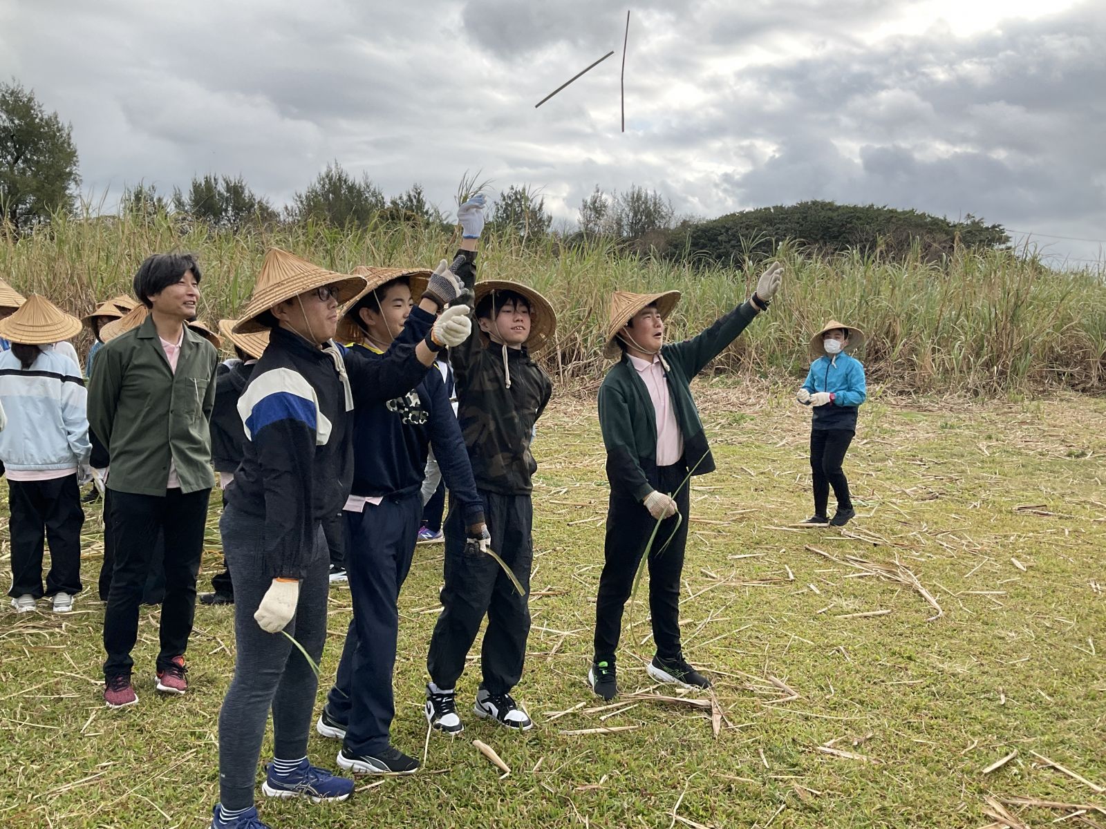 サトウキビの葉を使った遊びも教えてもらいました。
