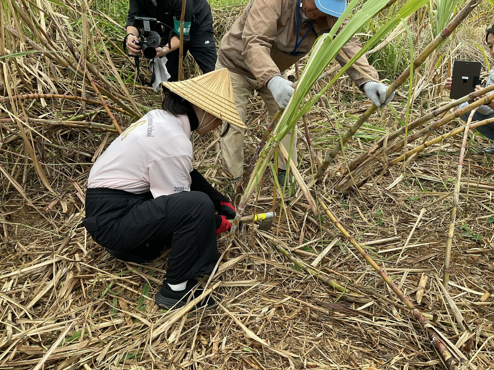 自分たちの背よりも高いサトウキビを鎌を使って収穫します。