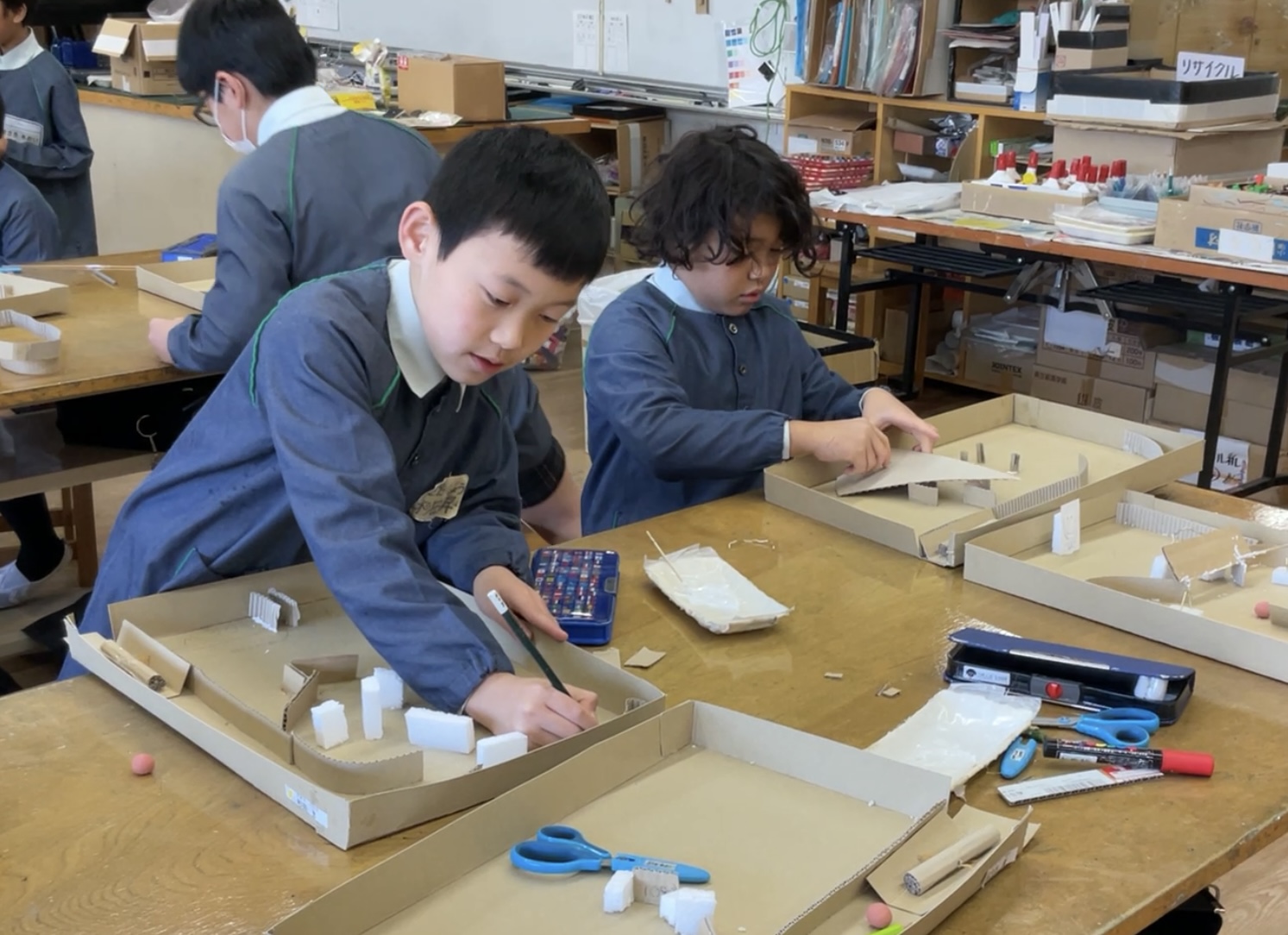 「中々、上手く入らないな。」 完成した作品は、友達同士で遊びました。