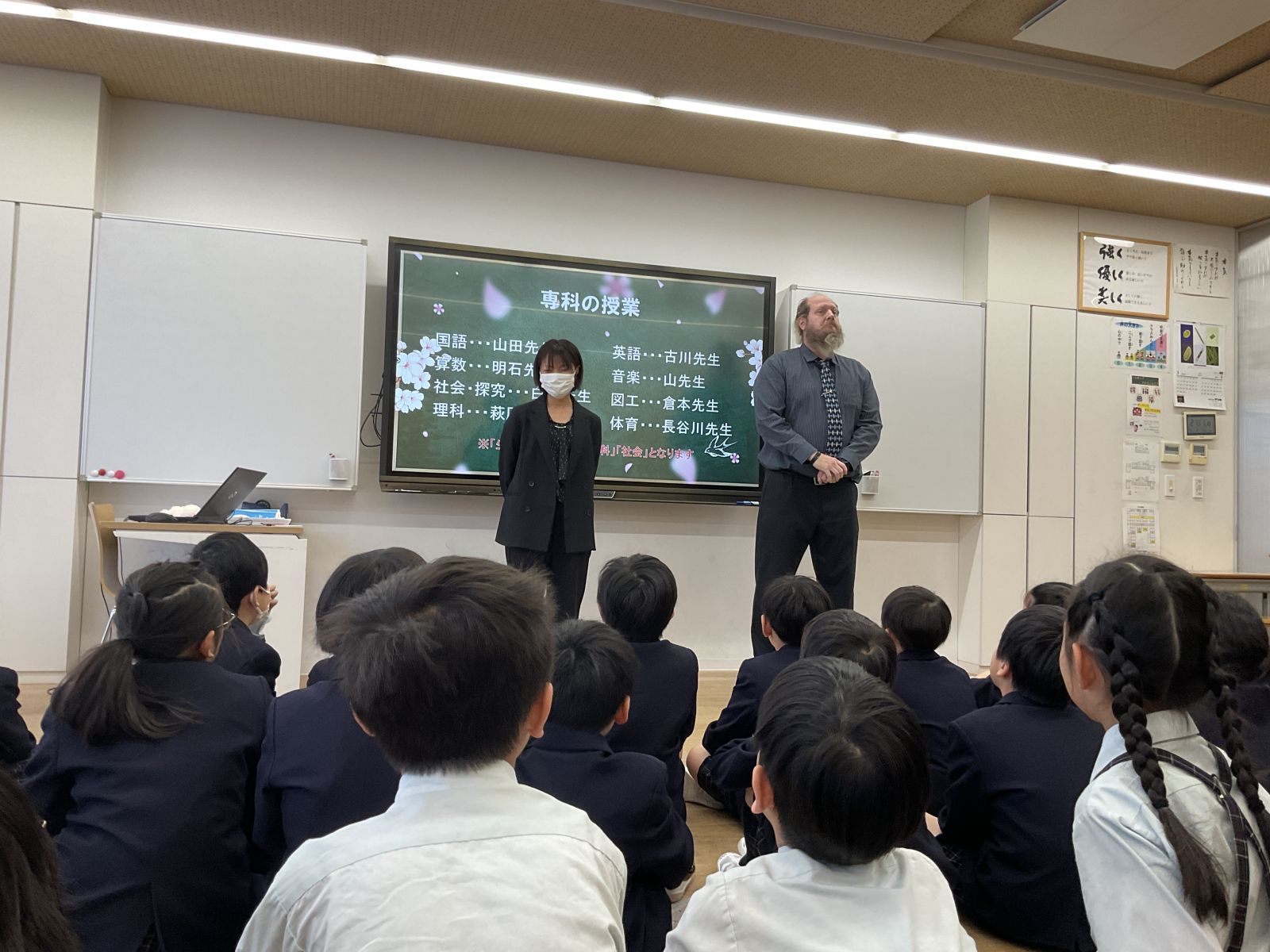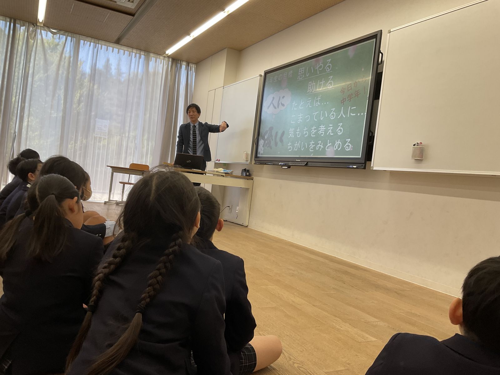 最初は、学年で集まって教科の先生の紹介と学年目標を確認しました。