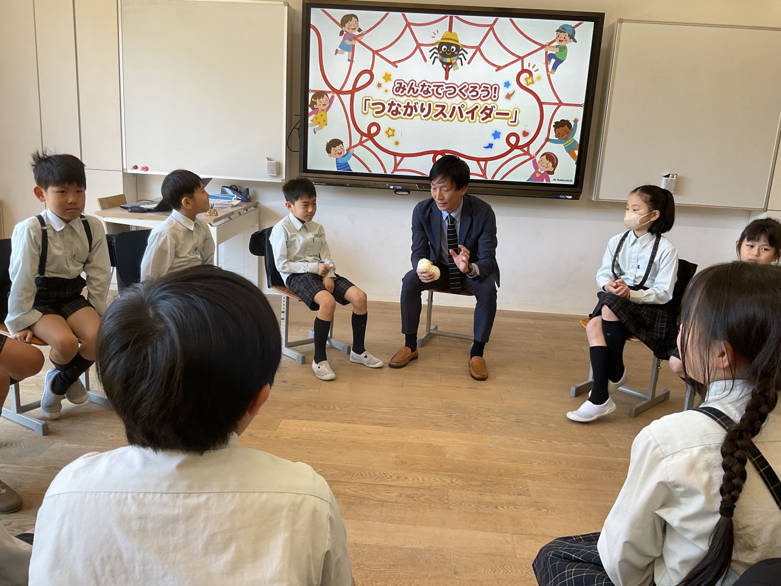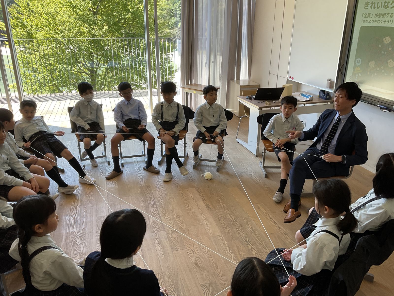 自己紹介ゲームでは、質問をしながらクモの巣を作れるように目指していきます。