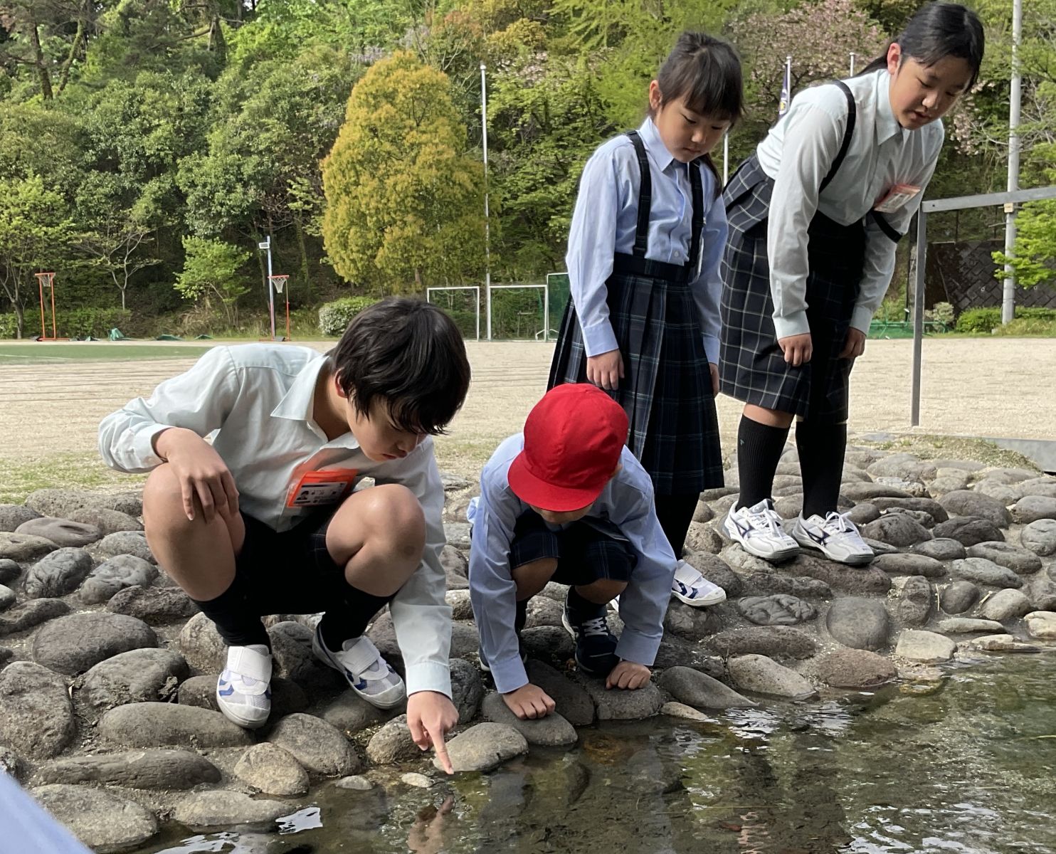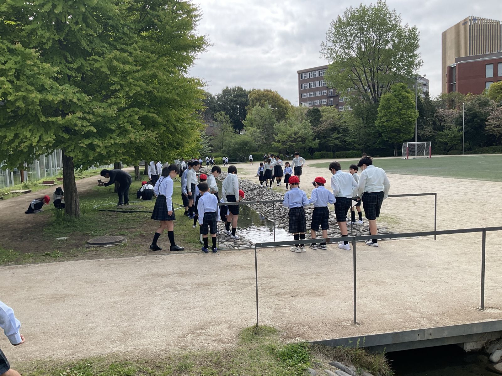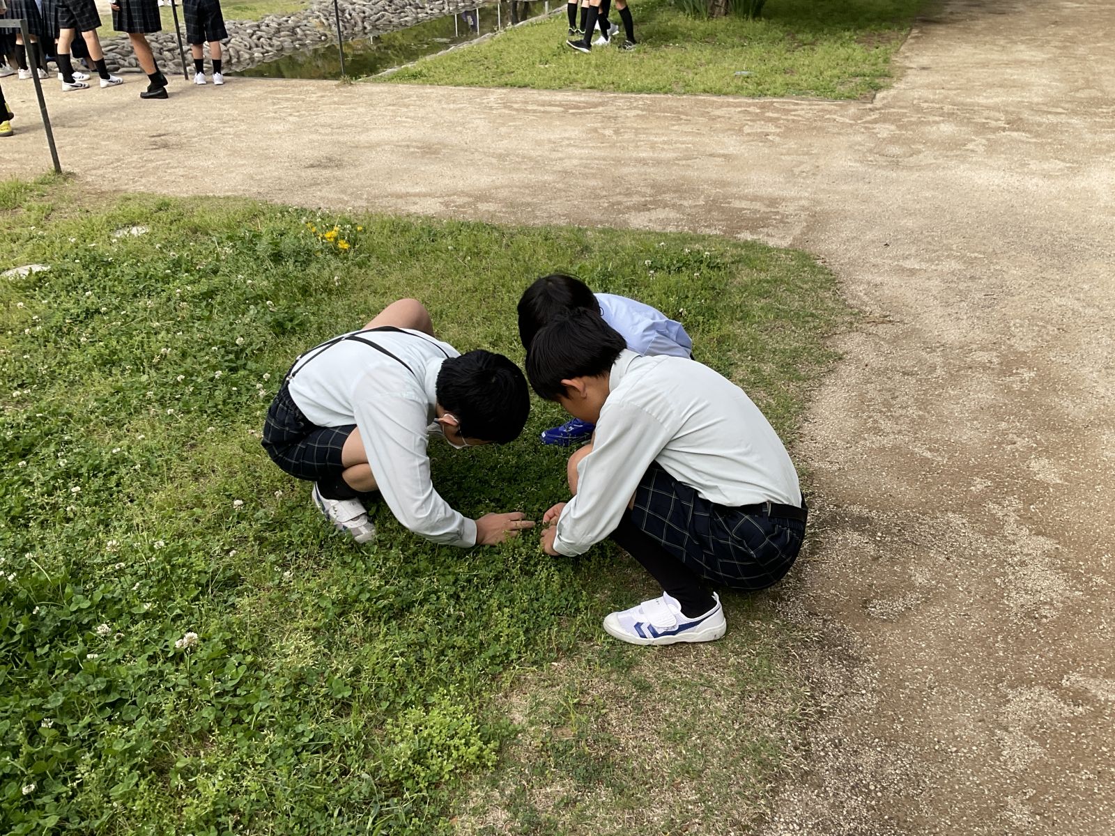 川の中にいる生物を観察したり、四つ葉のクローバー探しをしたり、ベンチに座ってみたりと