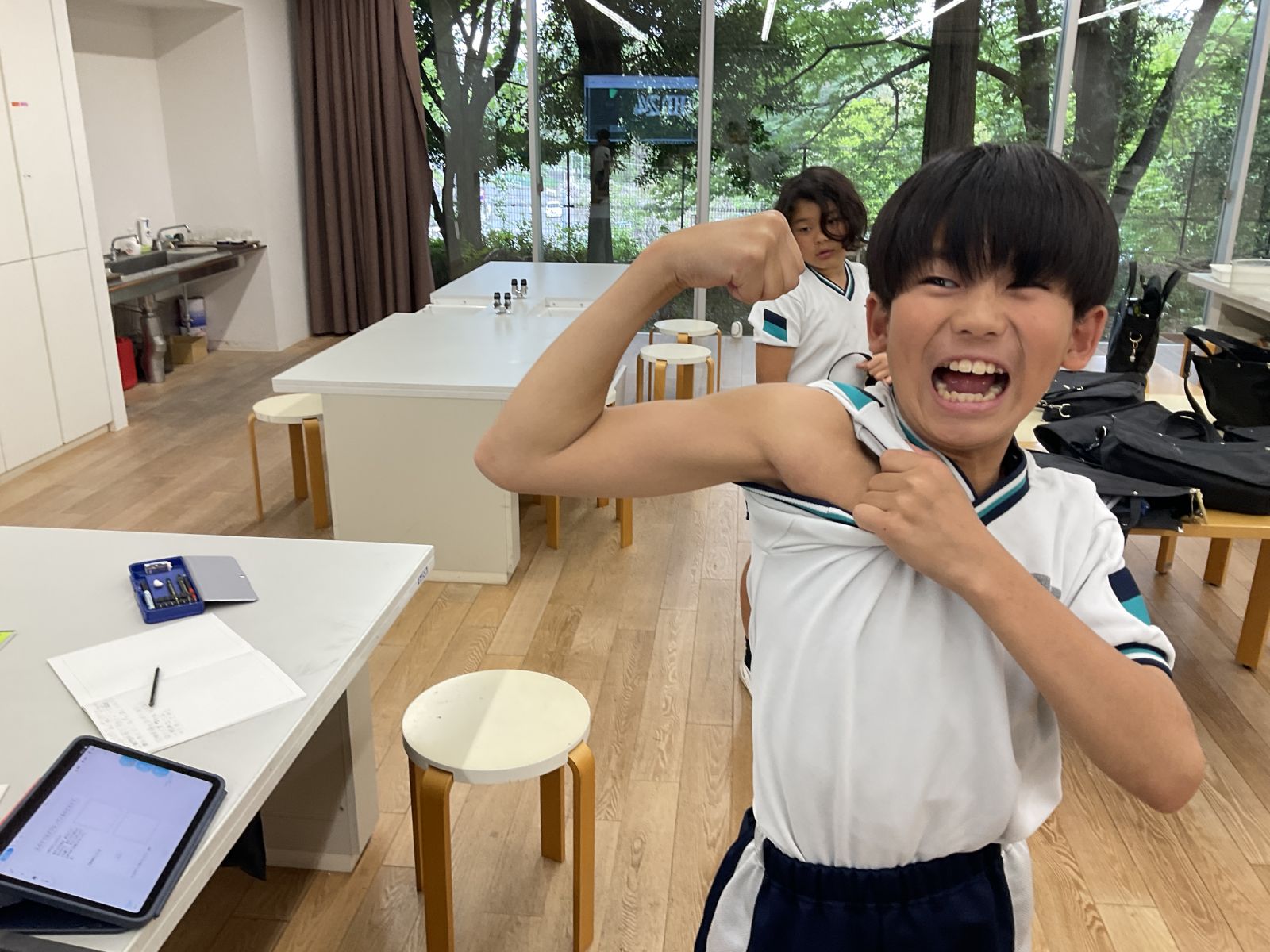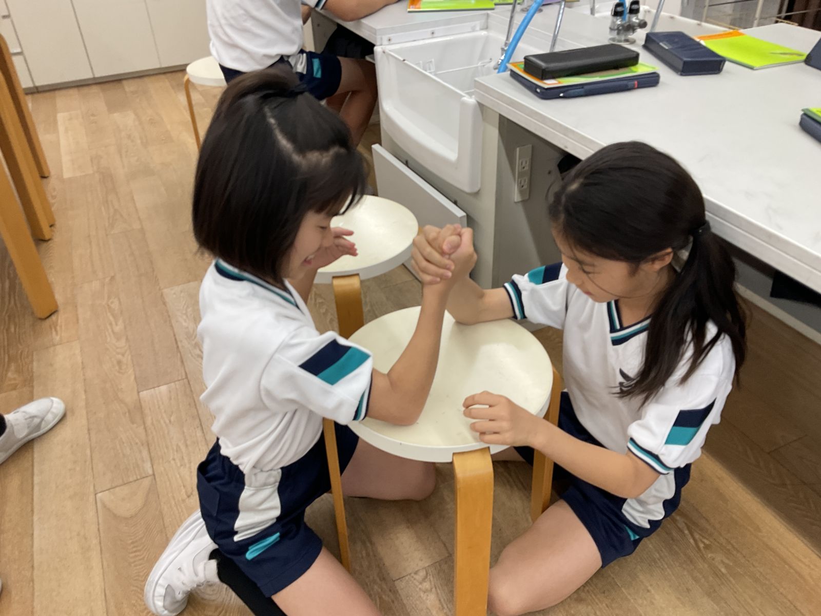 まずは、実際に重い物を持ち上げたり、友だちと腕相撲をしたりして、力を入れた時の腕の様子を観察しました。