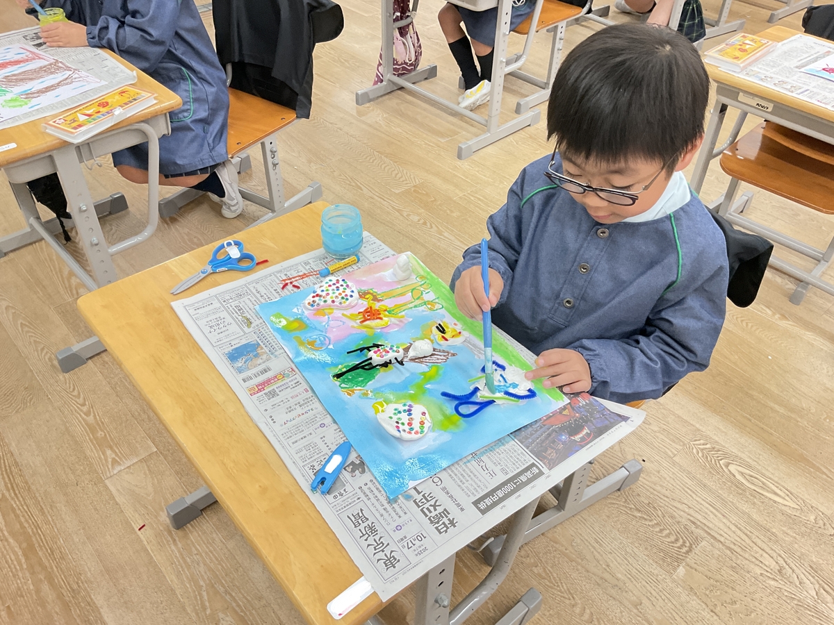帝小の日々2025-154 ☆1年図工 組み紙のバック星