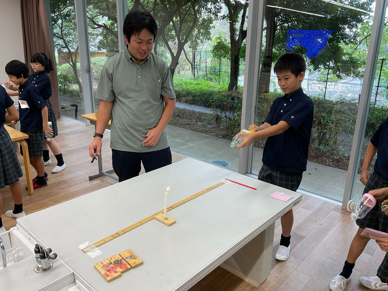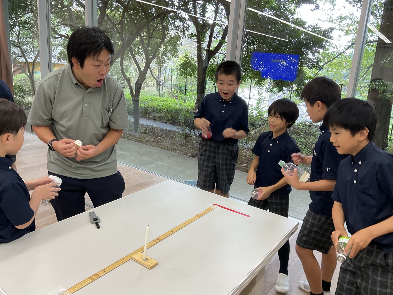 空気砲でろうそくの火を消したり的を倒したりして見えない空気の力に驚いていました。