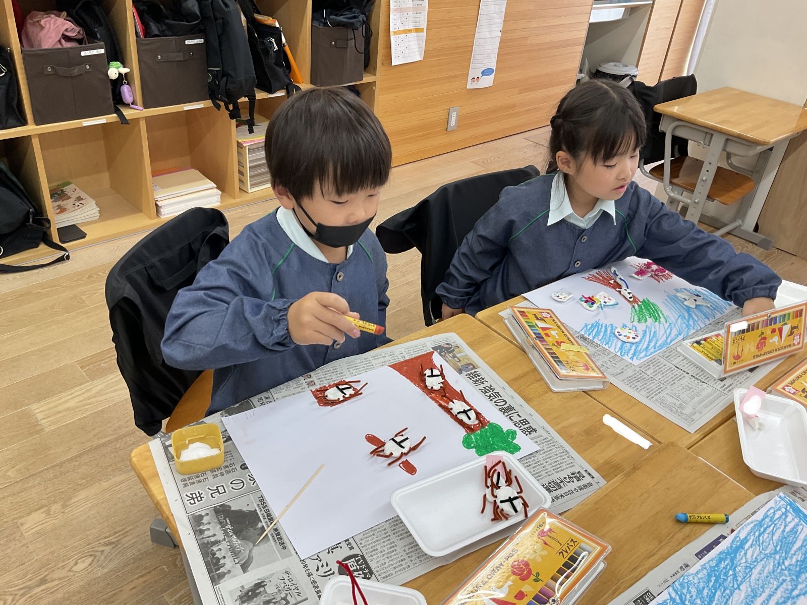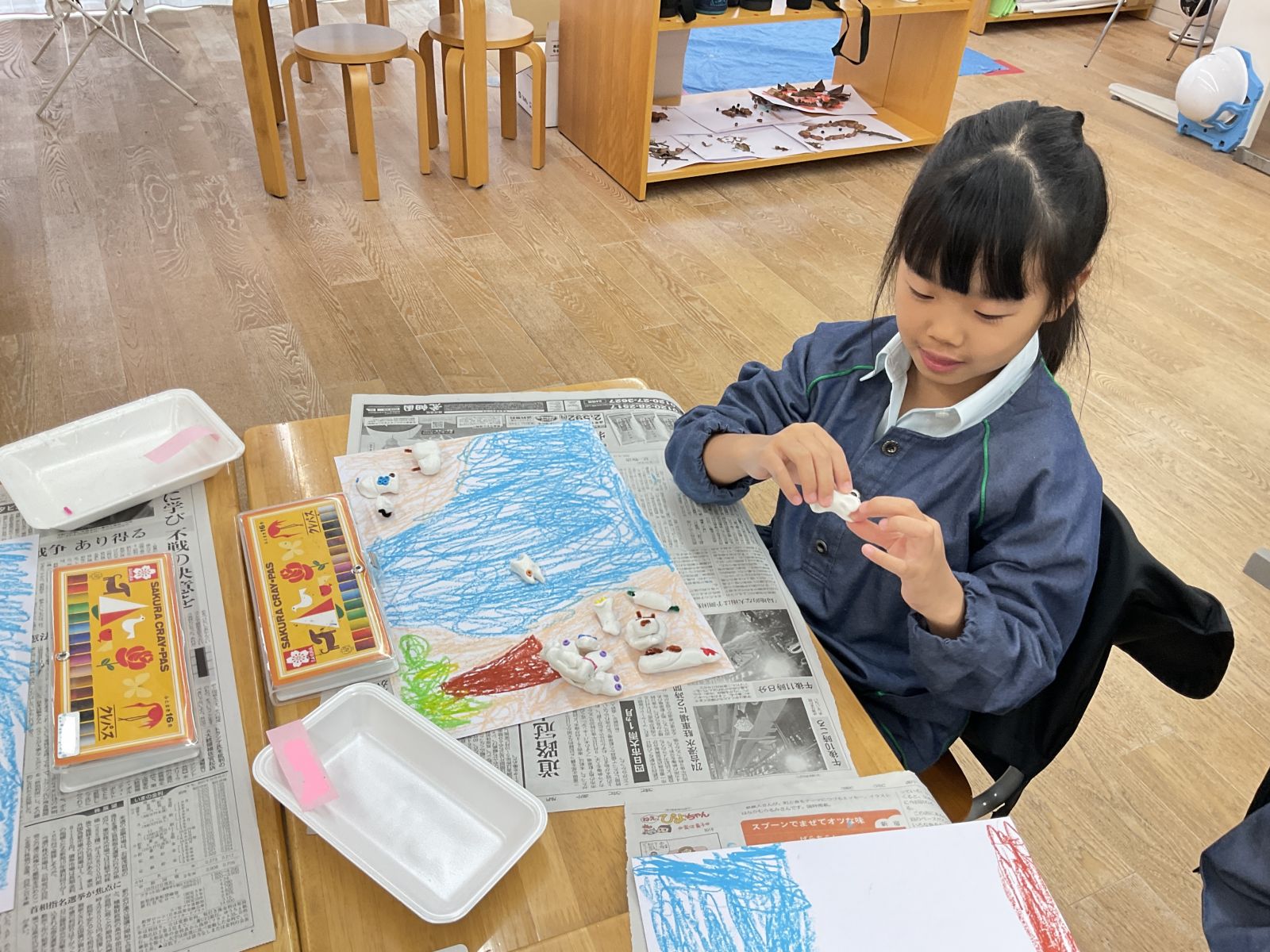 画面に並べながらモチーフ合う背景をクレパスでしっかりと描きます。.