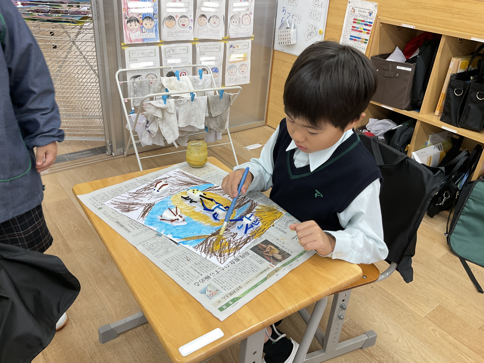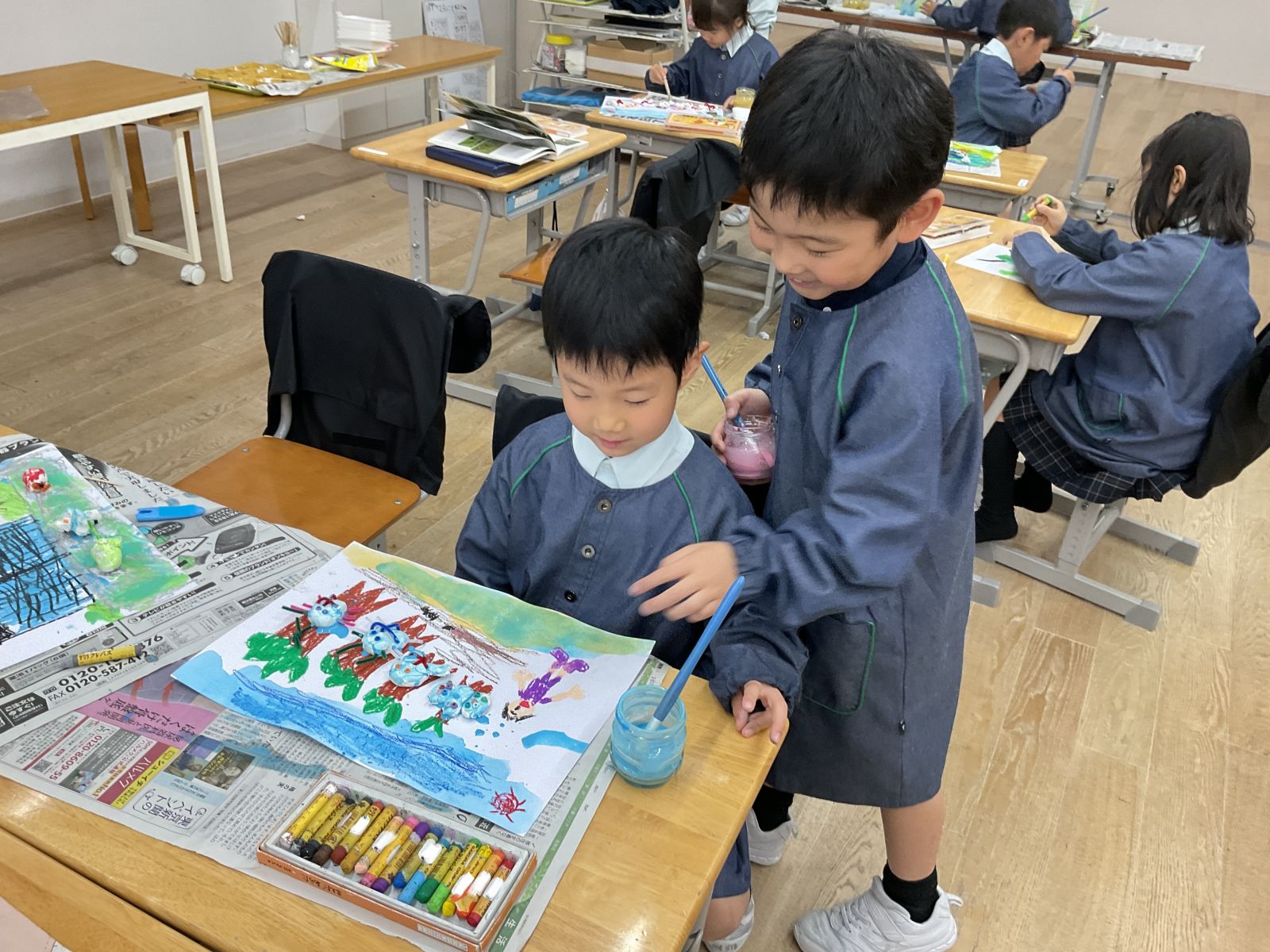 クレパスで描いた後は、水色・ピンク色・黄色・黄土色・黄緑色の5色の水彩絵の具から色を選びながら、
