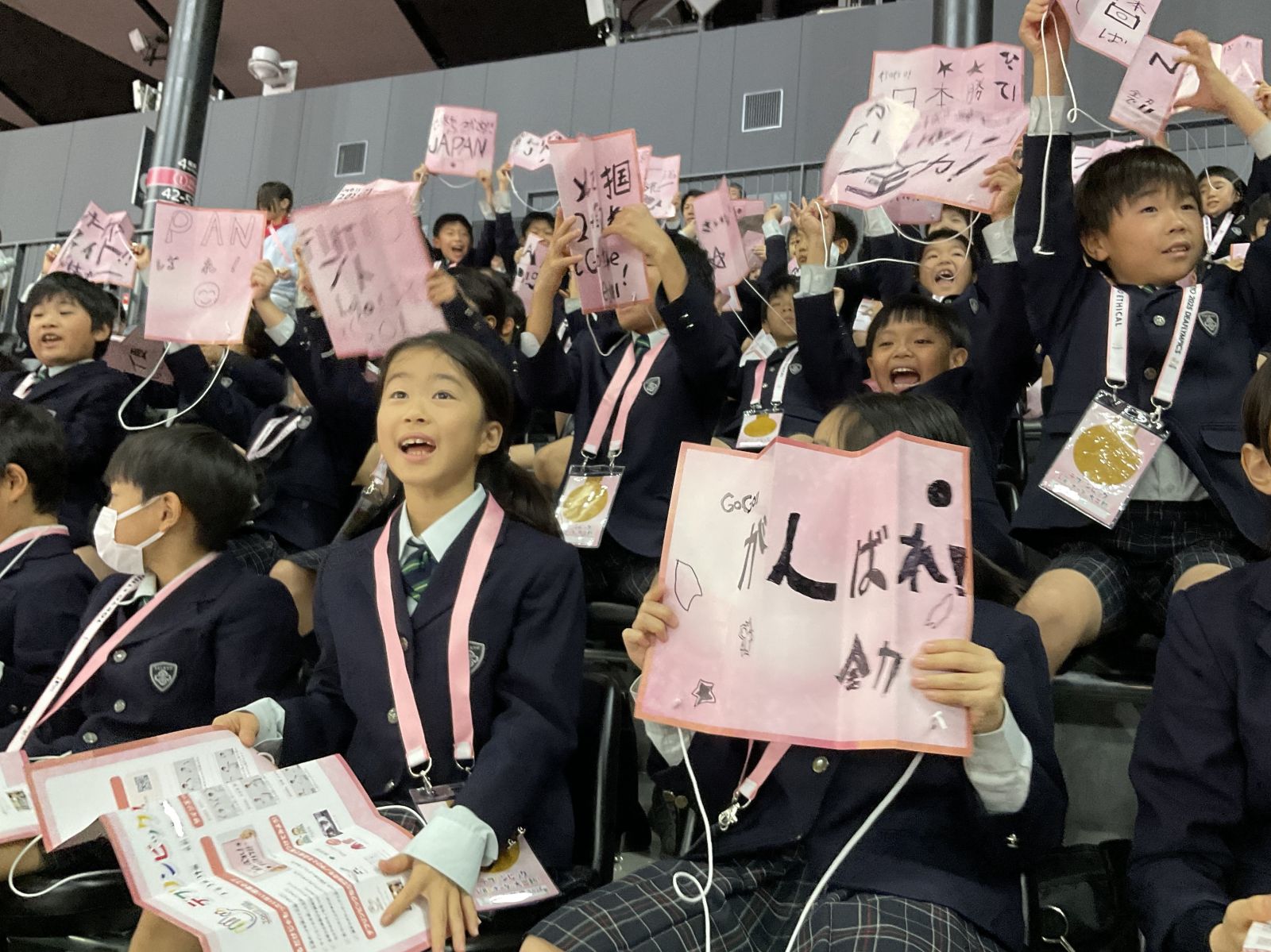事前学習で学んだサインエールや作成したボードをつかって応援できました。