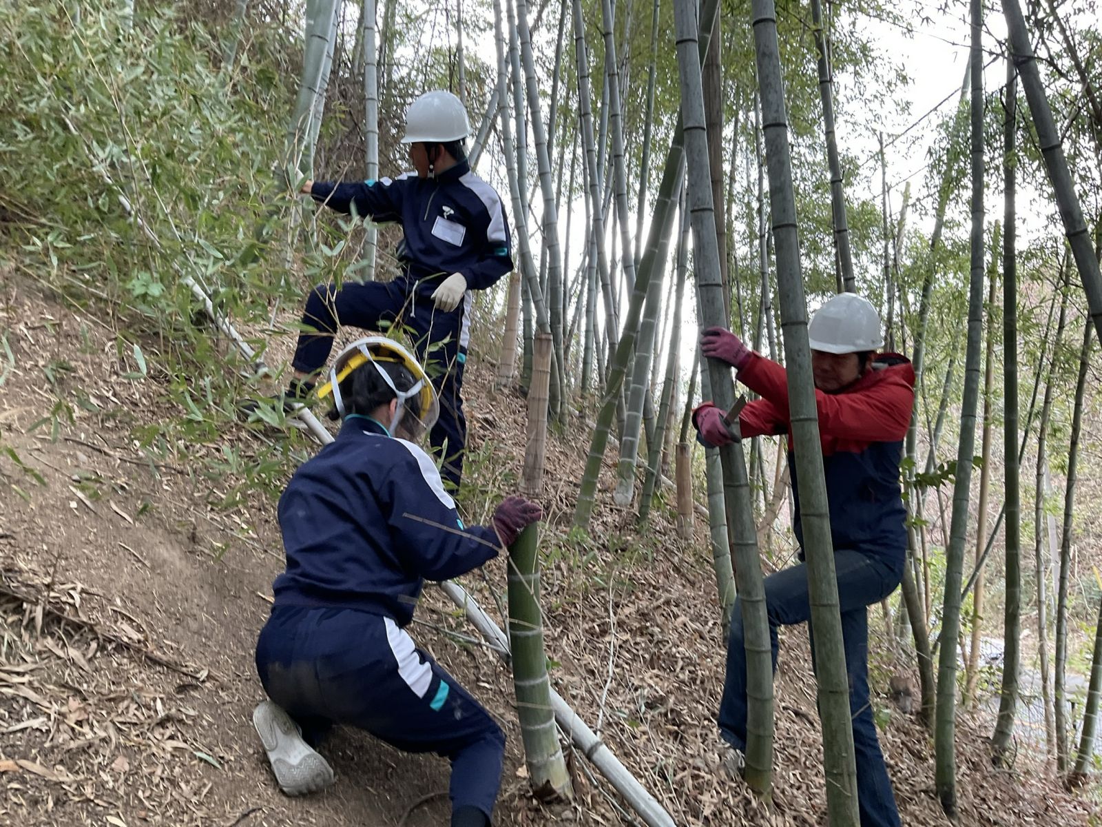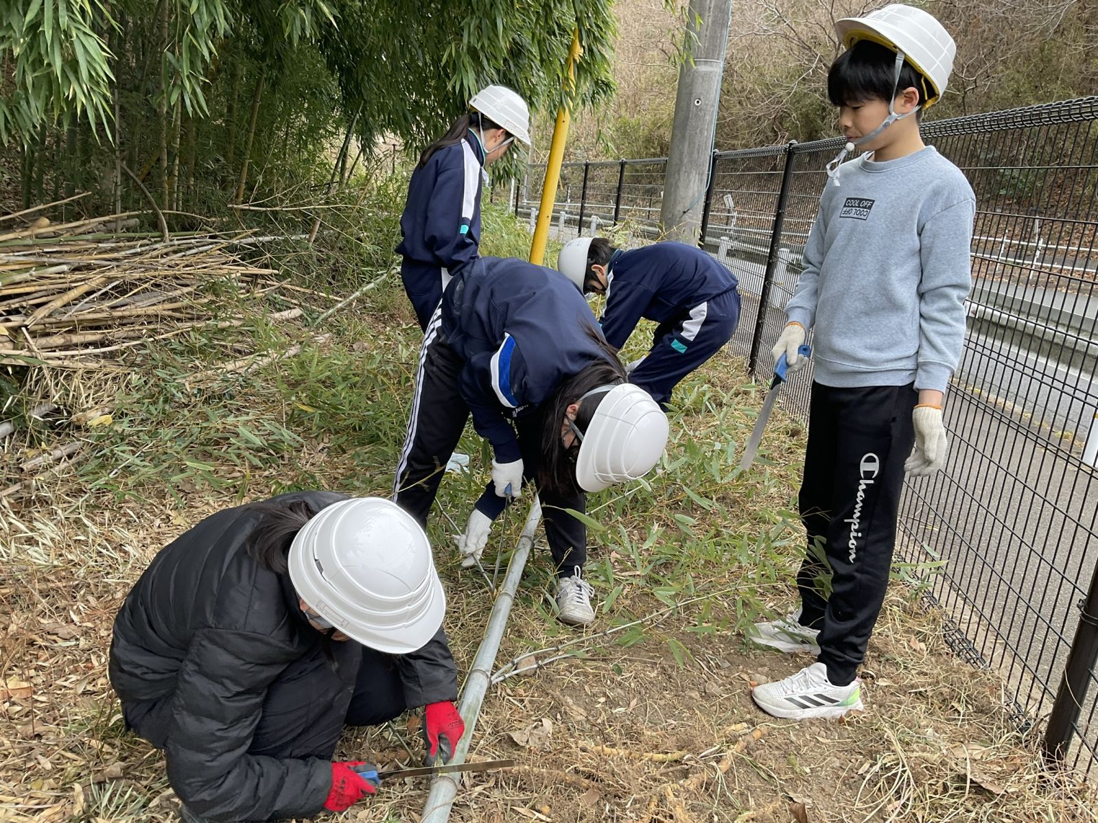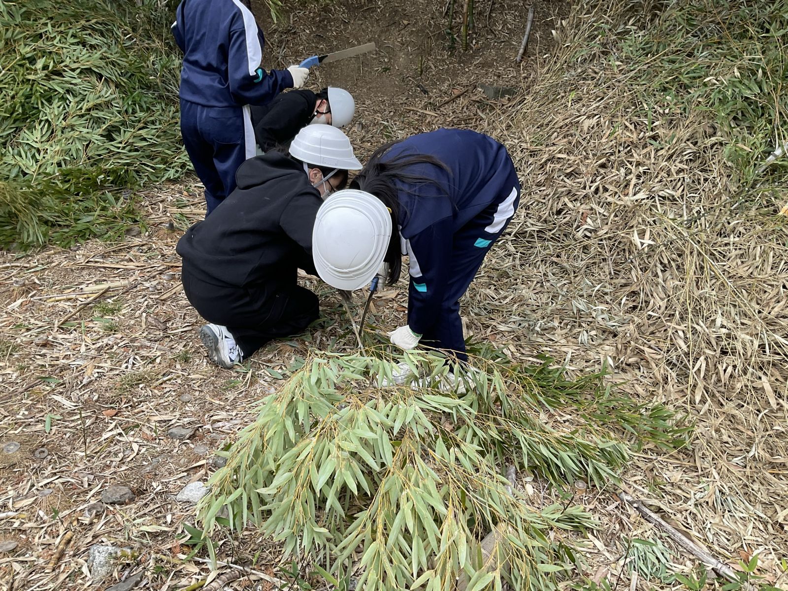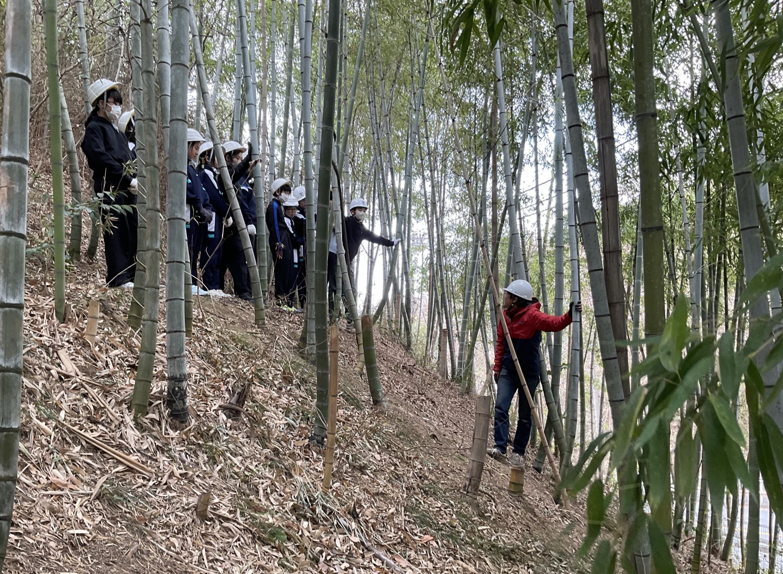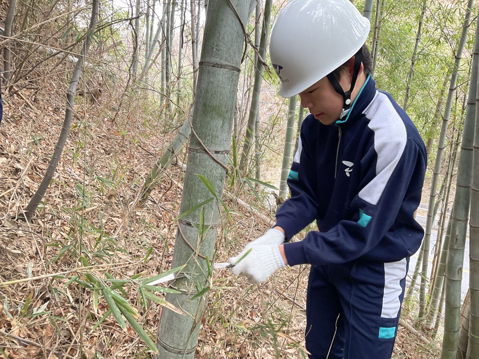 本校に生えている竹には真竹、孟宗竹などがあり、それぞれの特徴や竹の伐採のやり方を教えてもらいました。