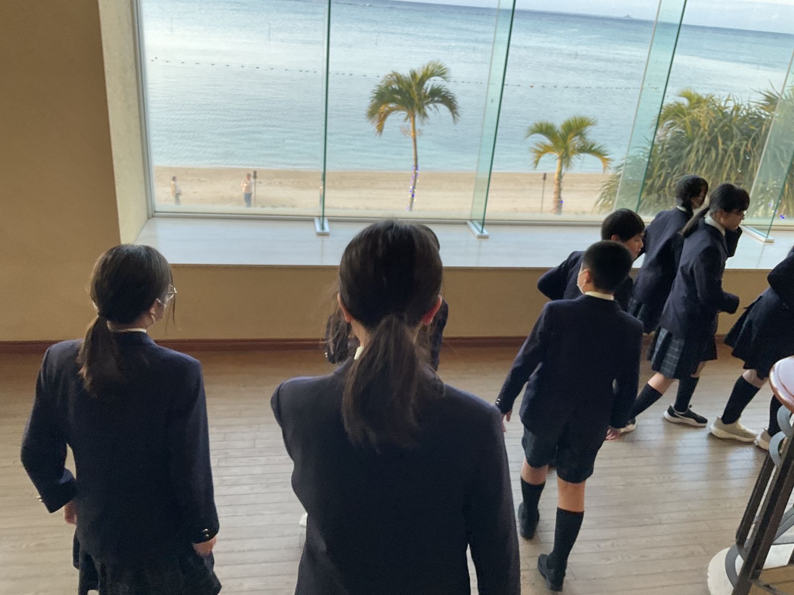 1日目の行程が終わり、ホテルに到着しました。ロビーからは海が一望できます。その景色に思わず「うわー」という声が溢れていました。
