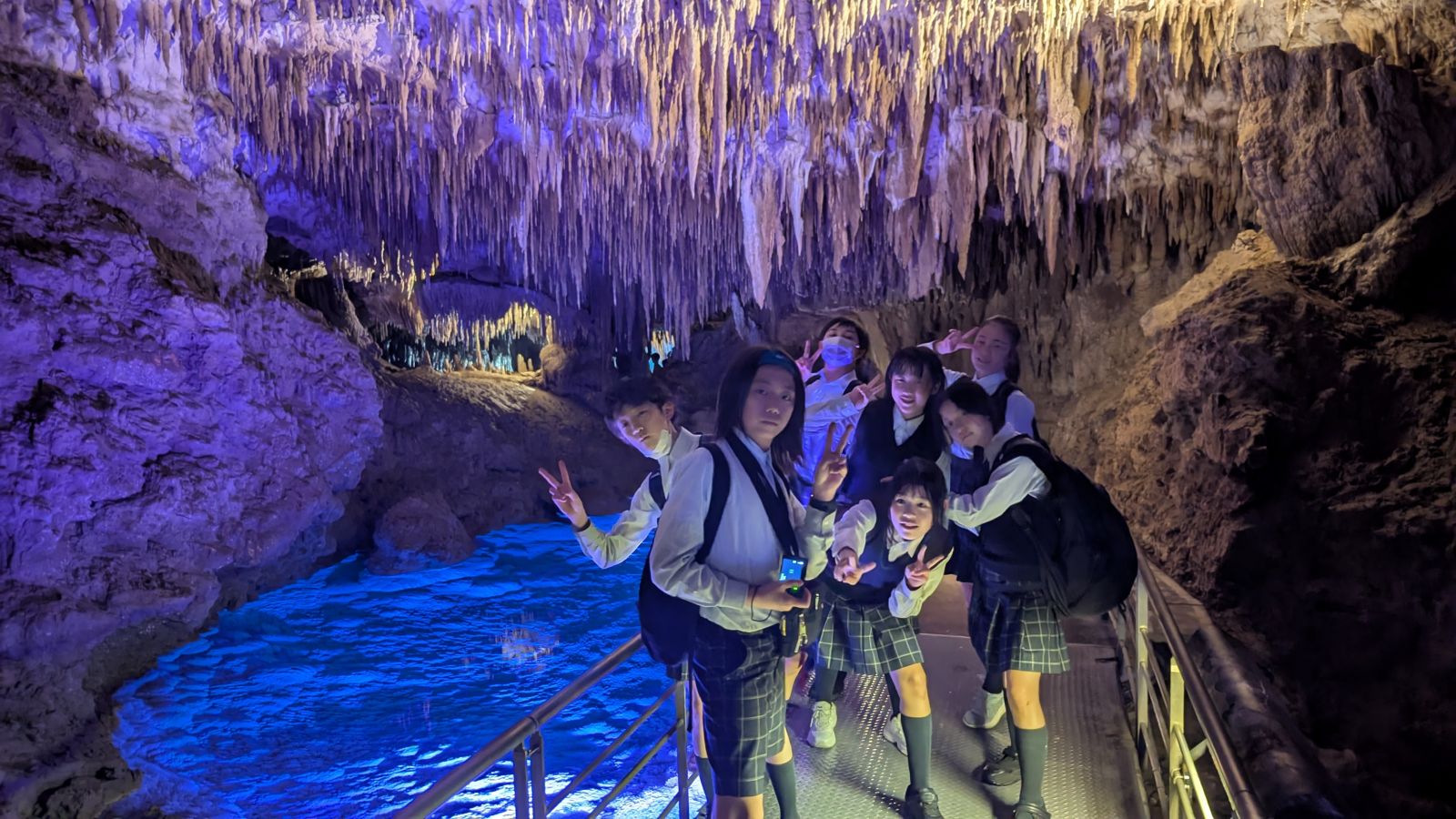 食後は東京では見られないフルーツや植物の観察、玉泉洞の見学をしました。はじめてみる鍾乳洞のスケールの大きさに子どもたちは大興奮でした。また、バレンタイン限定のピンク色のライトアップもあり嬉しそうに記念撮影しているグループもありました。