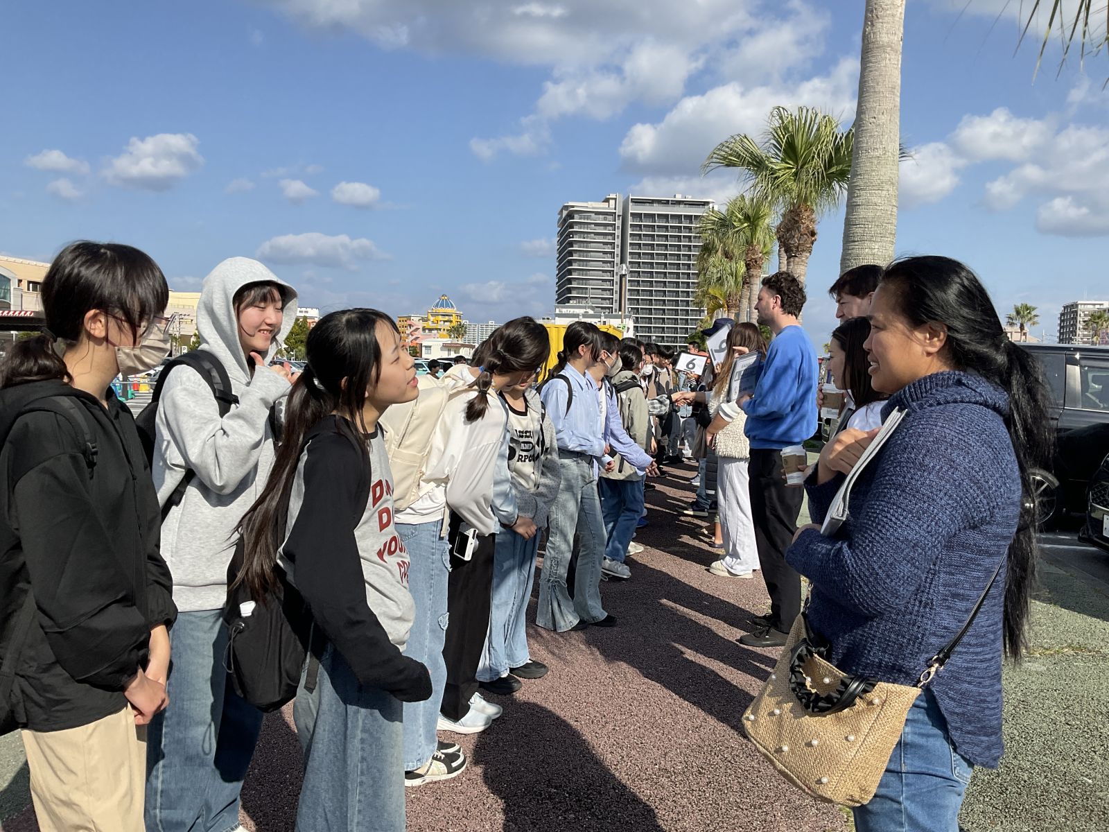 いよいよホストファミリーの方とご対面、バスの中での雰囲気とは少し変わり、緊張気味です。